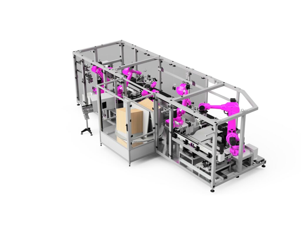 Manipulation robotisée : Les produits ou les boîtes sont manipulés par robot pour une précision optimale.